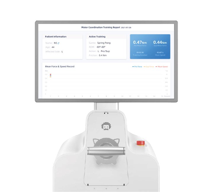 El WristMotus™ está integrado con sensores de fuerza y posición para medir el rendimiento del usuario desde múltiples aspectos, incluyendo el rango de movimiento (ROM), la fuerza, la cognición, el tiempo de respuesta, etc.