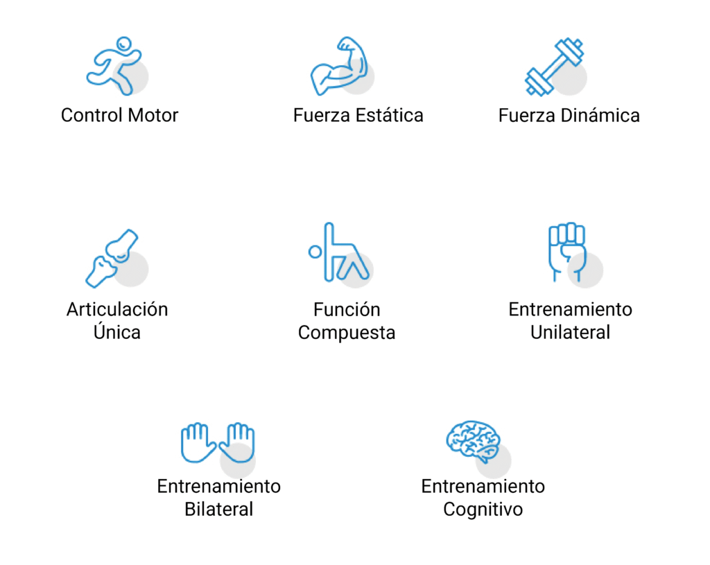 Consigue posibilidades ilimitadas en el entrenamiento. Por ejemplo, combina el control motor con el entrenamiento cognitivo; la fuerza isométrica con el entrenamiento de fuerza dinámica; el entrenamiento de una sola articulación con el entrenamiento de las actividades de la vida diaria (AVD) y el entrenamiento unilateral con el entrenamiento bilateral de brazos.